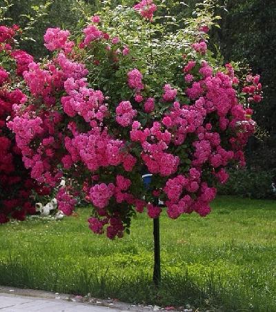 Ягодно-фуксиевая окраска цветов, которая в прохладу набирает пурпурные переливы, крупные грозди соцветий и непрерывное цветение очень быстро завоевали любовь розоводов во всем мире. Роза успела получить множество наград и медалей на самых престижных коркурсах роз мира. Цветки очень махровые и пушистые, диаметром 4-5 см, лепестки средние и аккуратно сложены. Появляются в крупных кистях по 5-15 штук. Великолепно держат дождь, не выгорают. Аромат мягкий.