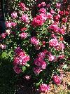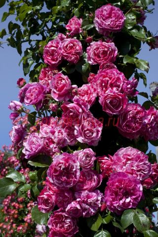 Сорт плетистой розы Инес Састр. Цветы очень крупные, сильно махровые (до 100 лепестков), оригинального цвета - насыщенно-розовый с бело-кремовыми штрихами. Аромат интенсивный, запах яблока и скошенной травы.