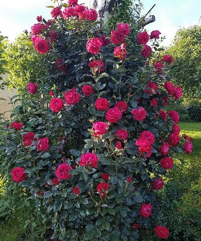 Цветки как у чайно-гибридной розы, бархатисто-красные, бокаловидные, махровые с высоким центром. Аромат сильный, специалисты определяют его как насыщенный аромат малины и вина. Кусты пряморослые, очень мощные. Листва крупная, блестящая, от тёмно-зелёной до красноватой, устойчивая к заболеваниям.Цветение очень обильное, продолжительное с июня и до заморозков.Очень устойчивый к болезням и морозостойкий сорт.