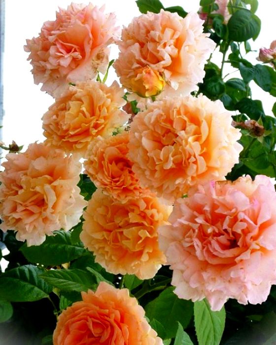 Polka - очень красивая и необычная роза, которую можно выращивать как невысокий клаймбер, либо как крупный, дугообразный шраб. Цветки восхитительные, насыщенного абрикосового цвета, выгорают до сливочного цвета по краям, с более темной подложкой лепестков, что создает игру теней и оттенков в цветке. Лепестки имеют волнистый край, напоминают креп-бумагу. Появляются по одному или в небольших кистях – редко более 3 шт в кисти, и очень хороши для цветочных аранжировок. Роза цветет серией волн (в холодном климате два раза, в жарком три), с редкими цветками между волнами. Листья достаточно устойчивы к заболеваниям, крупные, темные, блестящие. Идеальна для стен и изгородей, где нужна невысокая плетистая роза. Куст сильнорослый, довольно ветвистый. Листья достаточно устойчивы к заболеваниям, крупные, темные, блестящие .