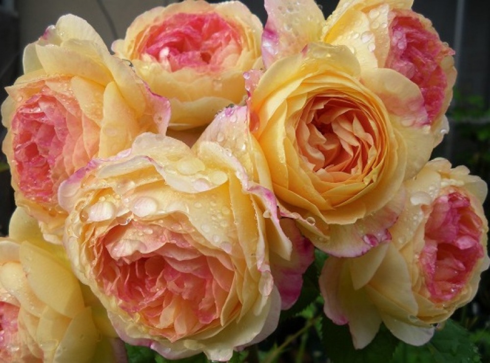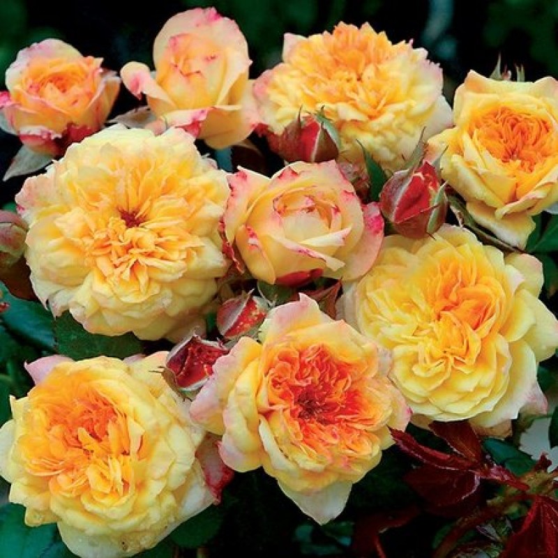 Желто-оранжевые цветки с розовым краем. Насыщенный ванильно-цитрусовый аромат. Цветки густомахровые, крупные, 11-12 см в диаметре, появляются обычно по одному, квартированные. Первое цветение обильное, затем более слабое. Куст ветвистый, прямостоячий. Листва блестящая, ярко-зеленая. Высота 80-100 см, ширина 40-60 см. Устойчивость к болезням средняя, несколько подвержен черной пятнистости. (www.helpmefind.com)