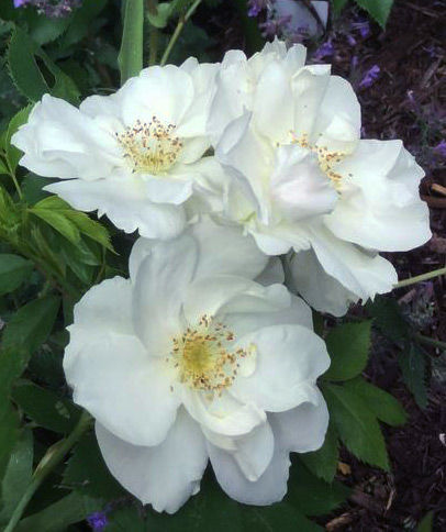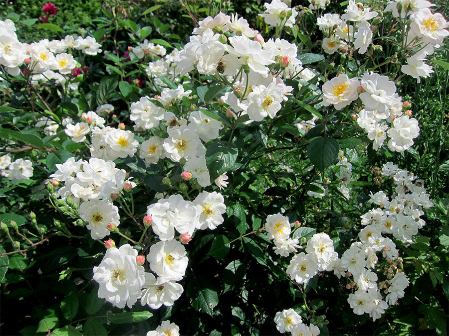 Бутоны заострённые. Цветки снежно-белые, полумахровые , плоской формы, в соцветиях по 3-10. Тычиночные нити почти белые. Волнистые лепестки трепещут на ветру и от этого цветки похожи на больших белоснежных бабочек. Аромат лёгкий. Цветение почти непрерывное, с конца июня до поздней осени. Листва тёмно-зелёная, глянцевая, кожистая, исключительно устойчивая к мучнистой росе и чёрной пятнистости. Лист состоит в среднем из 7 листочков. Куст плотный, высотой 70-100 см, шириной 50-130 см, привлекателен своими аркообразными побегами. Зимует под устойчивым снежным покровом.