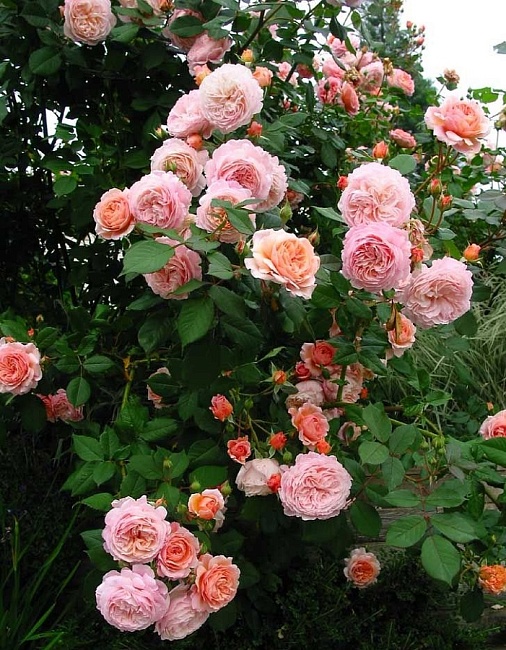 Одна из самых популярных роз Дэвида Остина, и это вполне заслужено. Крупные желтые бутоны раскрываются в чашевидные персиковые цветки с розовыми, золотистыми и медными тонами. Преобладание того или иного оттенка зависит от погоды. В жару цветки более персиковые, в холодную погоду более розовые. Аромат сильный, фруктовый с освежающей терпкой ноткой. Быстро растет, этой розе требуется много места. Устойчивость к заболеваниям лучше, чем у большинства роз Остина. Сорт зацветает одним из первых и цветет практически непрерывно. Для розы с такими крупными цветками, волны цветения повторяются с завидной регулярностью.Это сильный, устойчивый к заболеваниям сорт, достаточно быстро растущий, так что можно использовать его как плетистую розу.