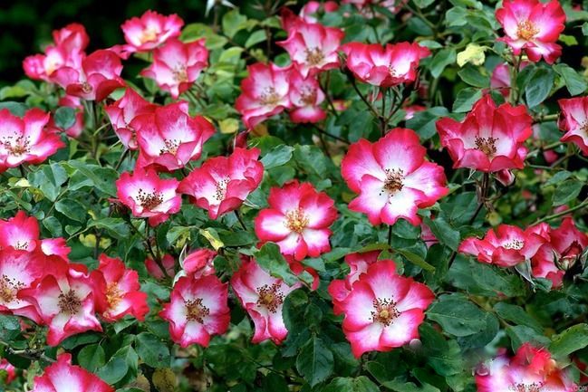 Эффектная кустарниковая роза с крупными, простыми, белыми с ярко-красной каймой, цветами. Листва тёмно-зелёная с красноватыми побегами. Очень устойчивый к заболеваниям. Цветёт в течение всего сезона.