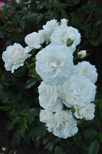 Белые цветки с мягким ароматом, квартированной формы, в соцветиях. Листва темно-зеленая, глянцевая.
