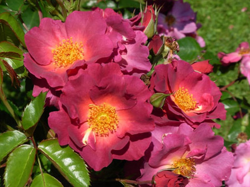 Полумахровые дымчато-пурпурные цветки с золотистым глазком, с насыщенным сладким пряным ароматом. Появляются в больших кистях на кусте с крупной листвой, который можно использовать для заднего плана бордера, либо выращивать как небольшую плетистую розу. (www.rosebuddies.com)