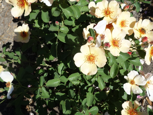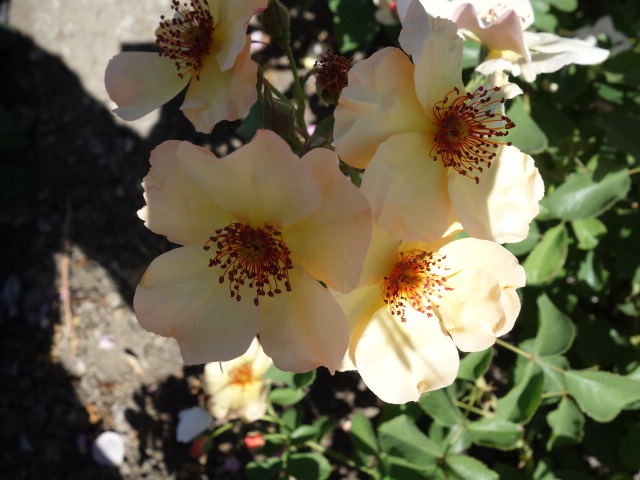 Цветы абрикосово-розовые с жёлтым оттенком и оранжевыми тычинками. Цветение продолжается в течении всего сезона.