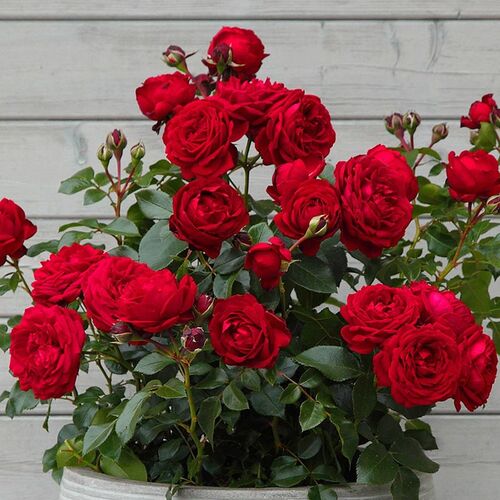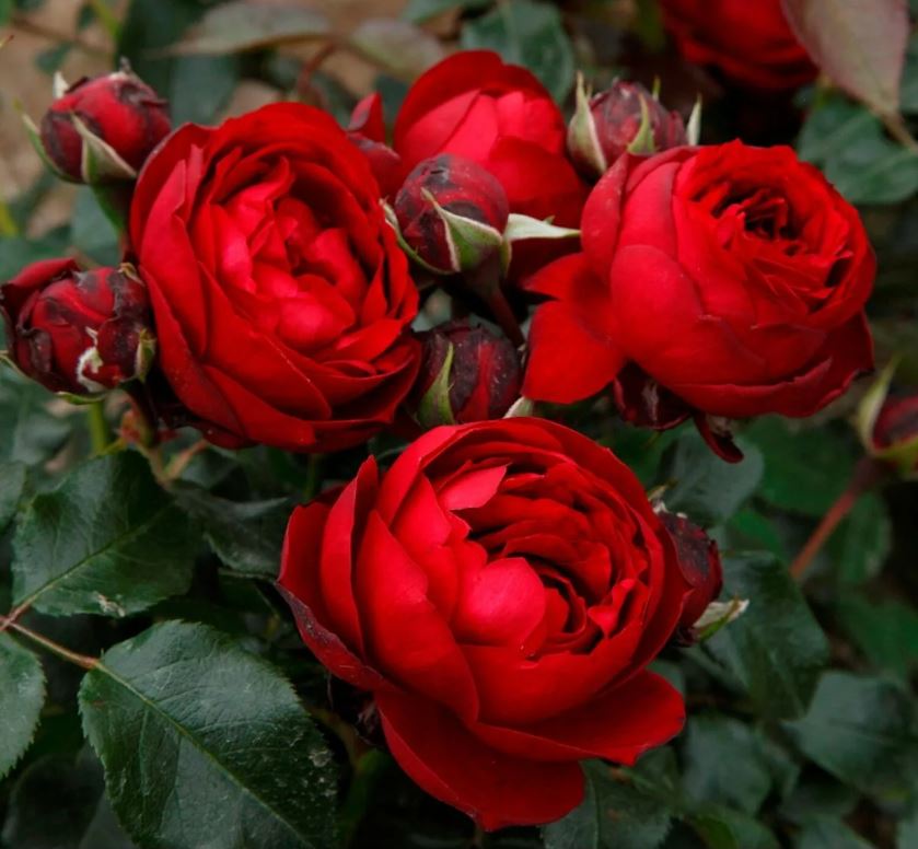 Цветки махровые, старинной шаровидной формы, красные, всегда в соцветиях. Цветение повторное. Листва тёмно-зелёная, глянцевая, полностью устойчивая к чёрной пятнистости, устойчивая к мучнистой росе. Куст компактный, аккуратный.Цветки устойчивые к атмосферным воздействиям, не выгорают.