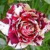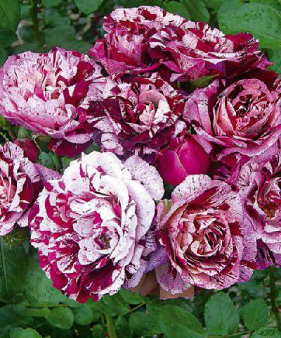 Цветки довольно пышные, среднемахровые, с большим количеством среднего размера лепестков. Их окрас очень необычный и сочетает в себе два оттенка, которые резко и неравномерно переходят друг в друга: кремово-розовые или кремово-сиреневые и насыщенно-бордовые. На одном стебле располагается от 3 до 5 бутонов.