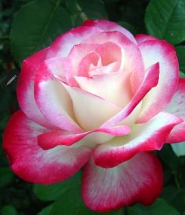 Цветки махровые, белые с красной каймой. Цветение повторное. Листва высокоустойчивая к чёрной пятнистости и мучнистой росе. Куст элегантной формы, вертикально растущий. |