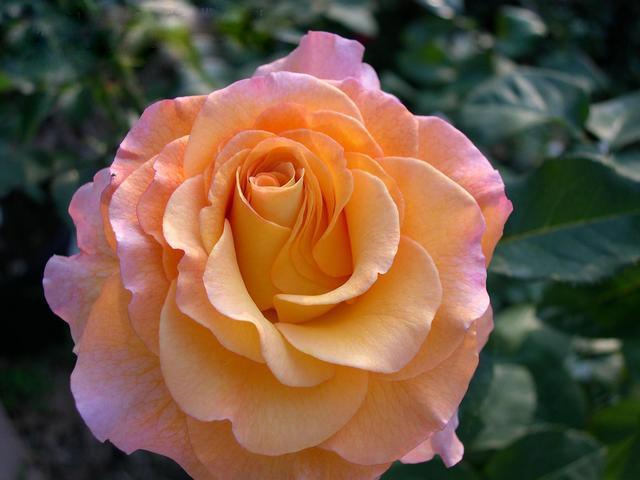 Роза с крупными цветками оригинальной оранжево-розовой окраски - внешние лепестки ярко-розовые, серединка - тёплая, персиковая; ближе к отцветанию персиковые оттенки в лепестках розовеют. Цветение обильное, практически непрерывное. Куст прямостоячий, листва крупная, зелёная, молодые побеги бордового цвета. |