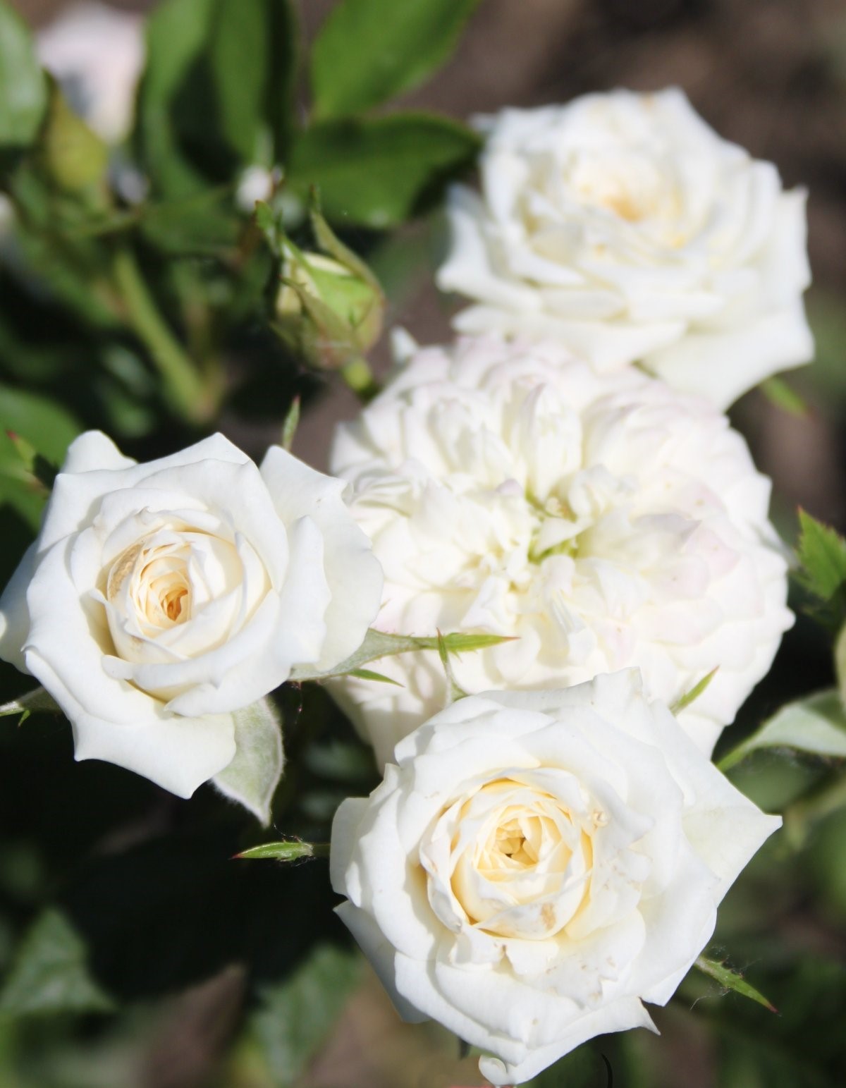 Куст усыпан махровыми (60-70 лепестков) белыми довольно крупными (Д=7-9 см.) цветами. Высота куста 60-70 см., ширина куста 120-200 см. Побеги растут в стороны и покрывают, со временем, достаточно большую площадь. Листва темно-зеленая глянцевая. Устойчивый к болезням и зимостойкий сорт. Имеет легкий аромат. Очень крепкая роза и цветет постоянно до морозов. |